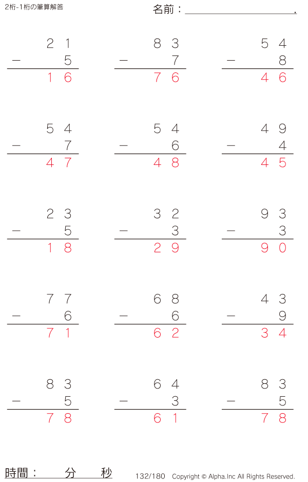 上記のボタンから「2桁-1桁の筆算」の算数数学ドリル・計算ドリル(PDFプリント)がダウンロードできます。個人利用は無料です(家庭以外での配布は有料です)。