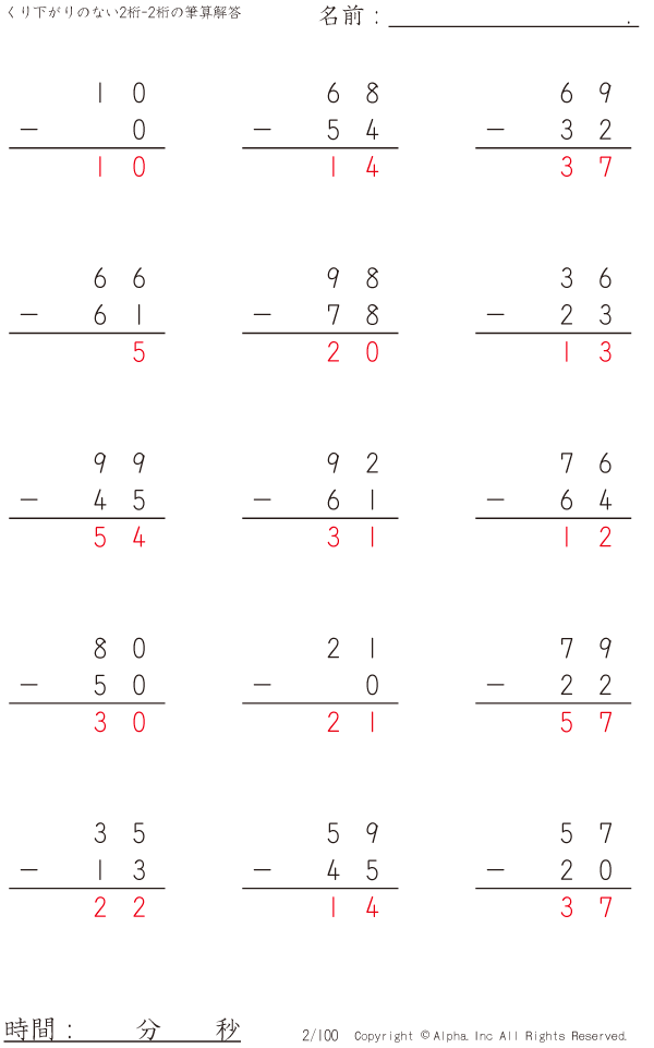 上記のボタンから「くり下がりのない2桁-2桁」の算数数学ドリル・計算ドリル(PDFプリント)がダウンロードできます。個人利用は無料です(家庭以外での配布は有料です)。