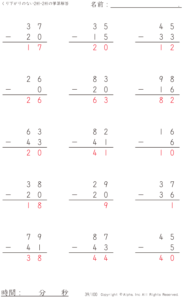 上記のボタンから「くり下がりのない2桁-2桁」の算数数学ドリル・計算ドリル(PDFプリント)がダウンロードできます。個人利用は無料です(家庭以外での配布は有料です)。