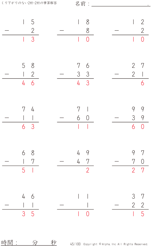 上記のボタンから「くり下がりのない2桁-2桁」の算数数学ドリル・計算ドリル(PDFプリント)がダウンロードできます。個人利用は無料です(家庭以外での配布は有料です)。