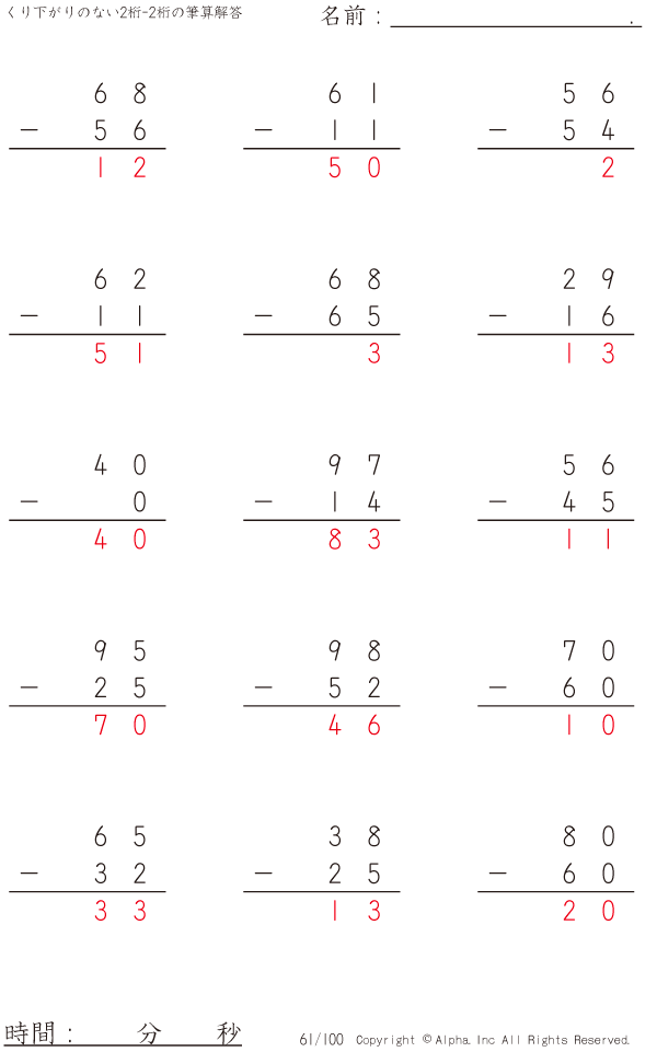 上記のボタンから「くり下がりのない2桁-2桁」の算数数学ドリル・計算ドリル(PDFプリント)がダウンロードできます。個人利用は無料です(家庭以外での配布は有料です)。