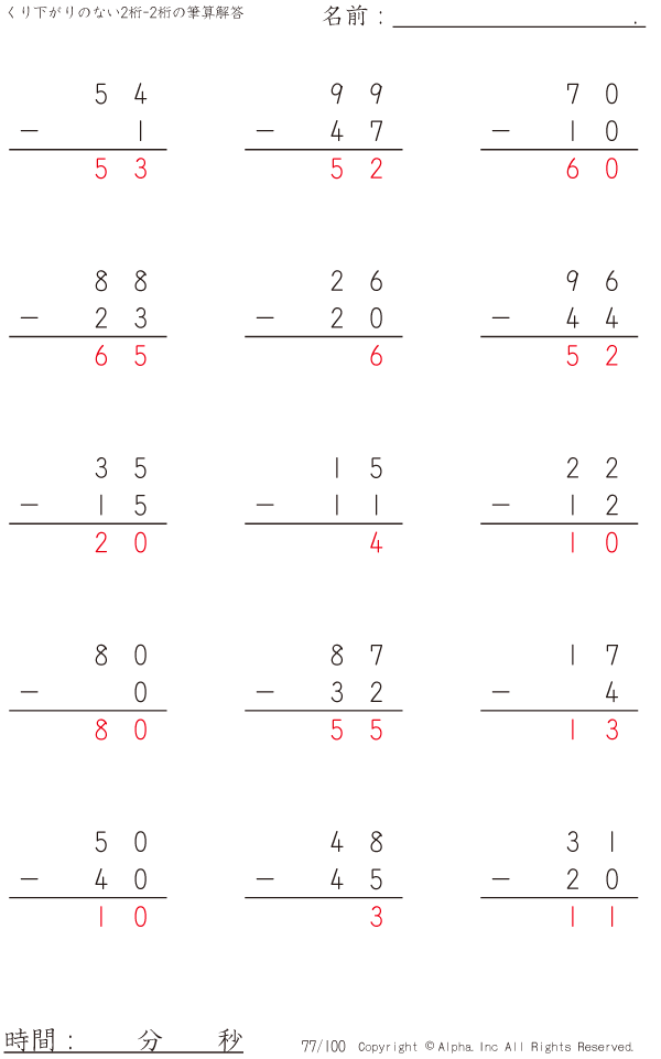 上記のボタンから「くり下がりのない2桁-2桁」の算数数学ドリル・計算ドリル(PDFプリント)がダウンロードできます。個人利用は無料です(家庭以外での配布は有料です)。