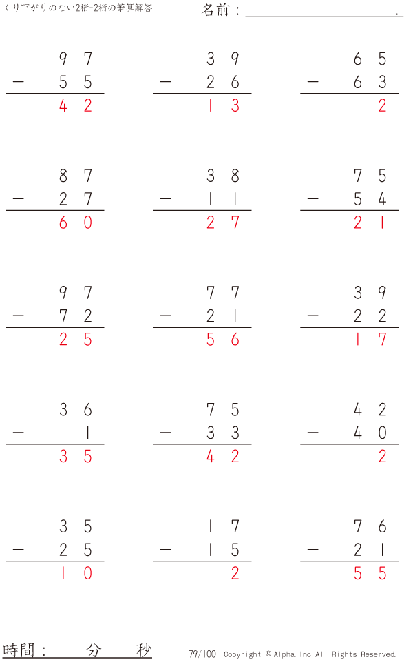 上記のボタンから「くり下がりのない2桁-2桁」の算数数学ドリル・計算ドリル(PDFプリント)がダウンロードできます。個人利用は無料です(家庭以外での配布は有料です)。