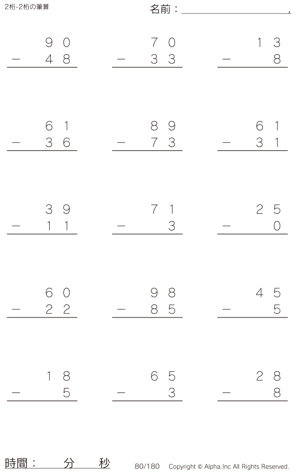上記のボタンから「2桁-2桁の筆算」の算数数学ドリル・計算ドリル(PDFプリント)がダウンロードできます。個人利用は無料です(家庭以外での配布は有料です)。