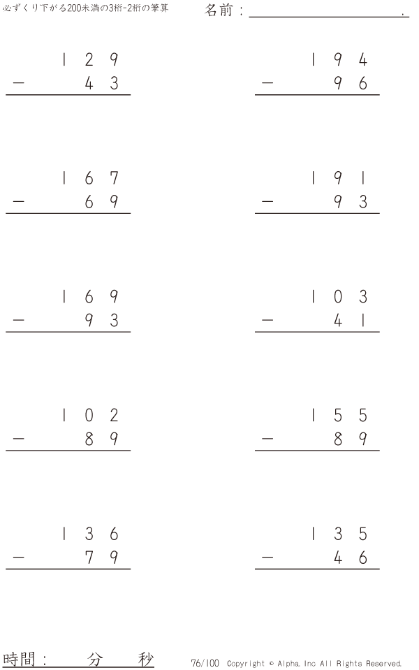 上記のボタンから「必ずくり下がる200未満の3桁-2桁の筆算」の算数数学ドリル・計算ドリル(PDFプリント)がダウンロードできます。個人利用は無料です(家庭以外での配布は有料です)。