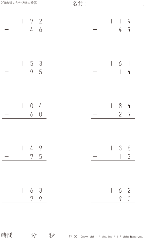 200未満の3桁-2桁の筆算 [問題]009/100