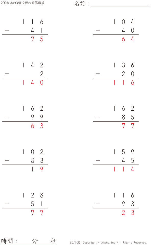 200未満の3桁-2桁の筆算の問題解答ガイド