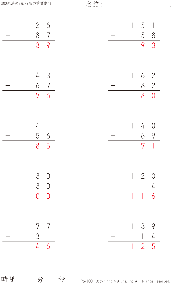 200未満の3桁-2桁の筆算の問題解答ガイド