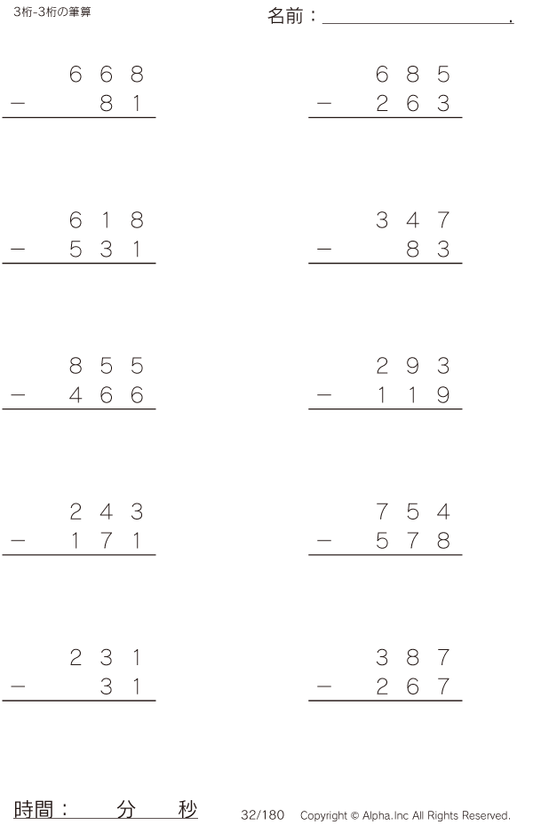 上記のボタンから「3桁-3桁の筆算」の算数数学ドリル・計算ドリル(PDFプリント)がダウンロードできます。個人利用は無料です(家庭以外での配布は有料です)。