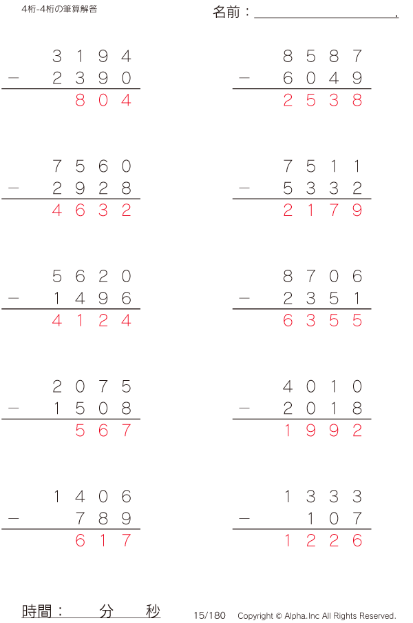 上記のボタンから「4桁-4桁の筆算」の算数数学ドリル・計算ドリル(PDFプリント)がダウンロードできます。個人利用は無料です(家庭以外での配布は有料です)。