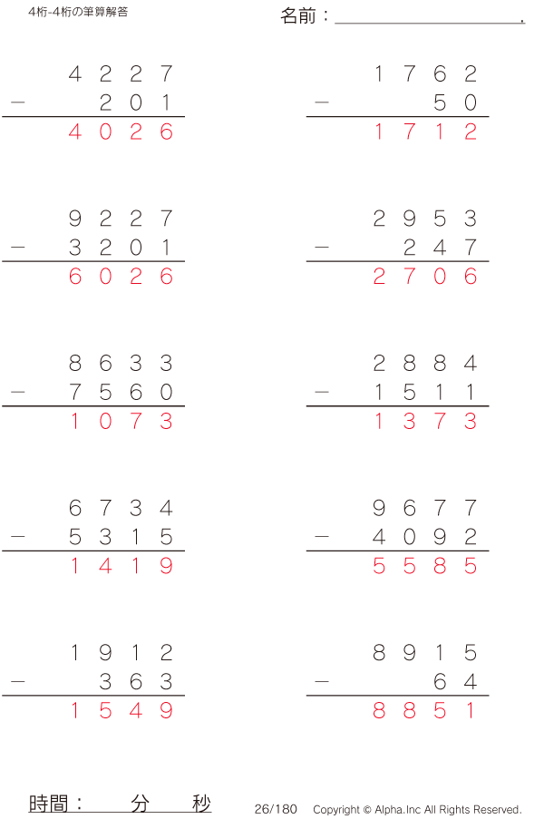 上記のボタンから「4桁-4桁の筆算」の算数数学ドリル・計算ドリル(PDFプリント)がダウンロードできます。個人利用は無料です(家庭以外での配布は有料です)。