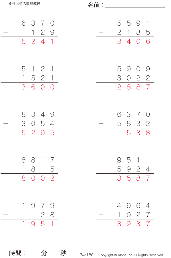 4桁-4桁の筆算 [解答]034/180