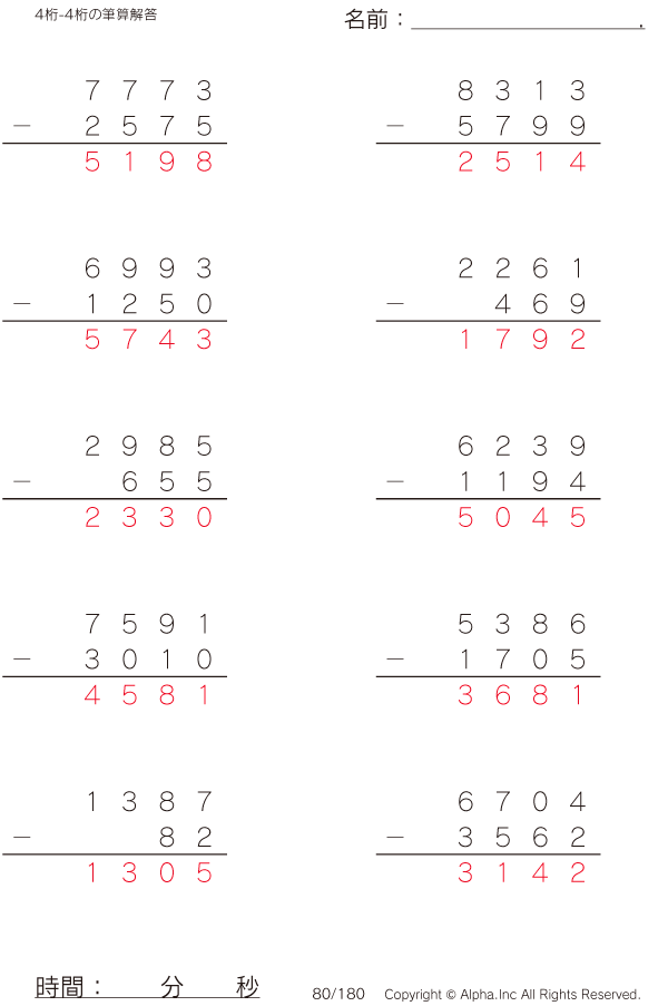 上記のボタンから「4桁-4桁の筆算」の算数数学ドリル・計算ドリル(PDFプリント)がダウンロードできます。個人利用は無料です(家庭以外での配布は有料です)。