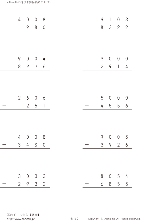 4桁-4桁の筆算(中央がゼロ) [問題]009/100