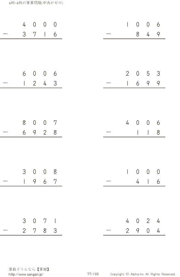 4桁-4桁の筆算(中央がゼロ) [問題]077/100