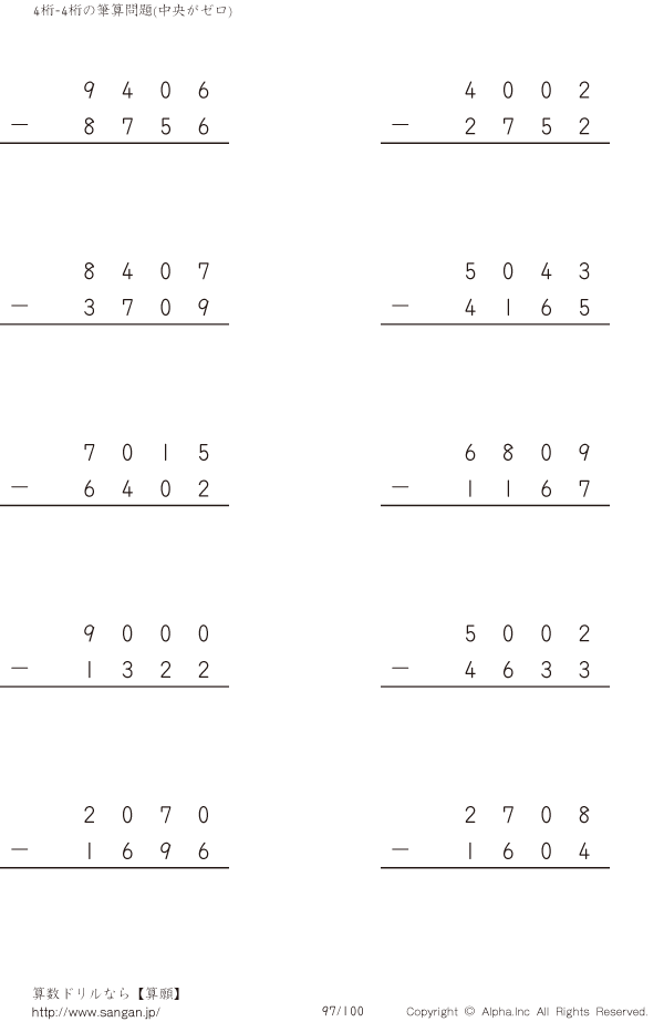 4桁-4桁の筆算(中央がゼロ) [問題]097/100