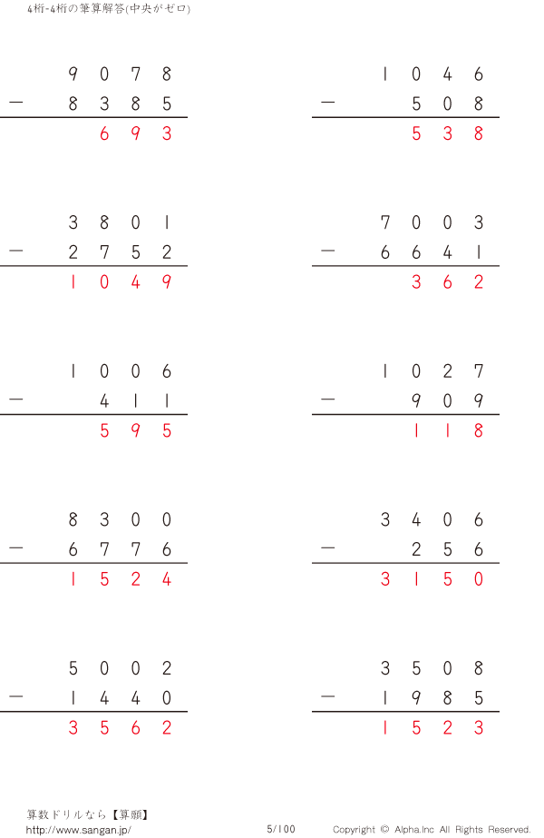 4桁-4桁の筆算(中央がゼロ) [解答]005/100