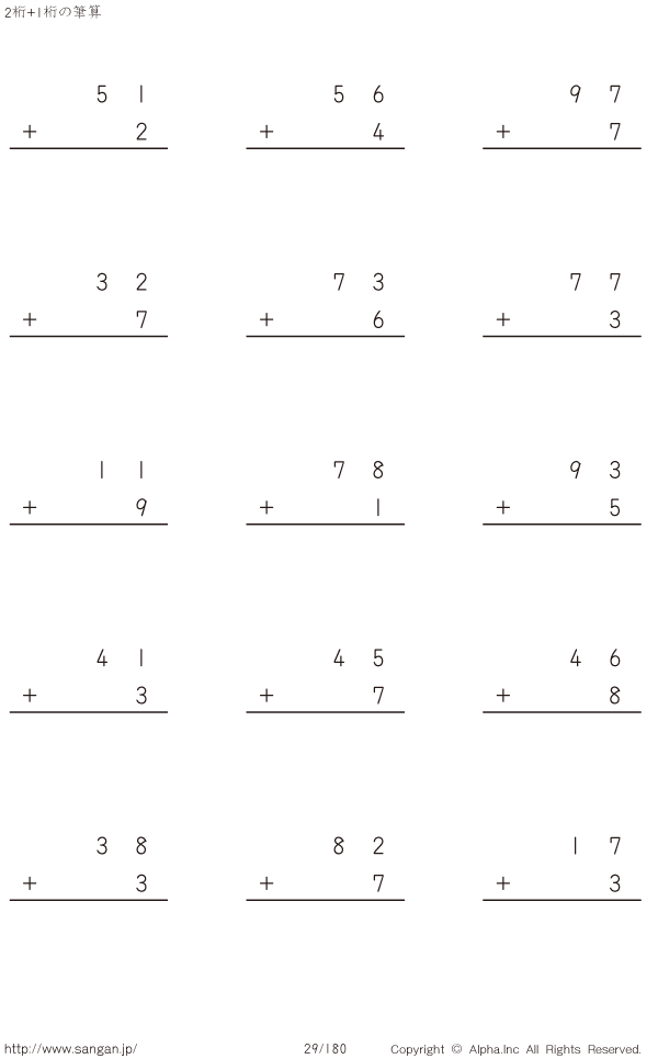 上記のボタンから「2桁+1桁の筆算」の算数数学ドリル・計算ドリル(PDFプリント)がダウンロードできます。個人利用は無料です(家庭以外での配布は有料です)。