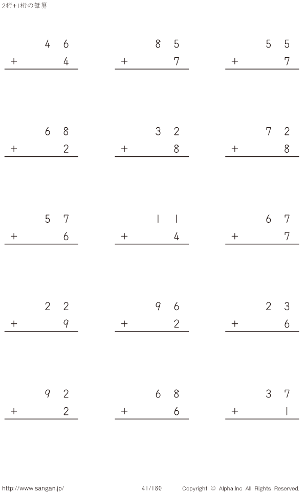 上記のボタンから「2桁+1桁の筆算」の算数数学ドリル・計算ドリル(PDFプリント)がダウンロードできます。個人利用は無料です(家庭以外での配布は有料です)。