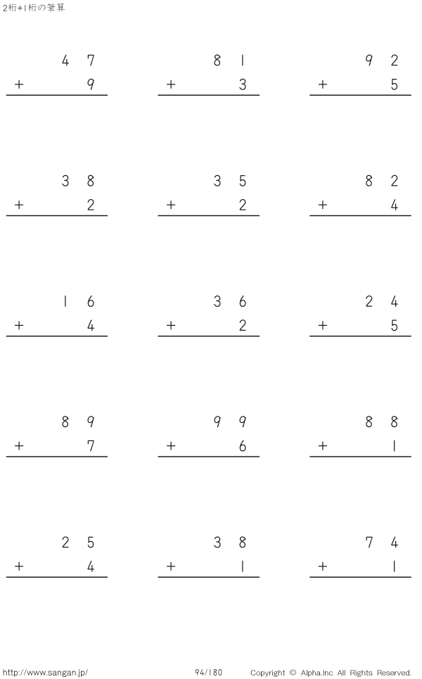 上記のボタンから「2桁+1桁の筆算」の算数数学ドリル・計算ドリル(PDFプリント)がダウンロードできます。個人利用は無料です(家庭以外での配布は有料です)。