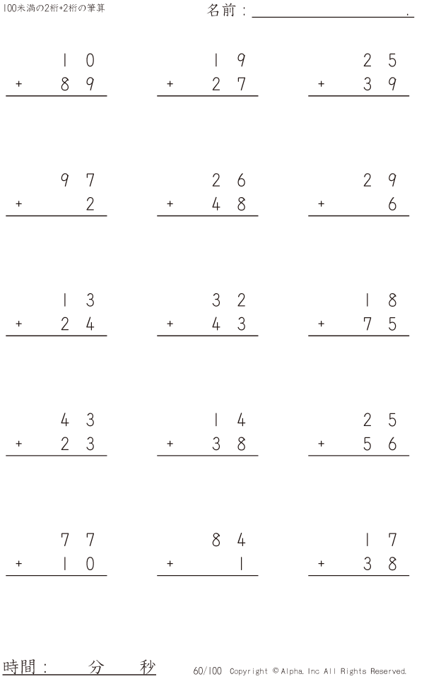 上記のボタンから「100未満の2桁+2桁の筆算」の算数数学ドリル・計算ドリル(PDFプリント)がダウンロードできます。個人利用は無料です(家庭以外での配布は有料です)。