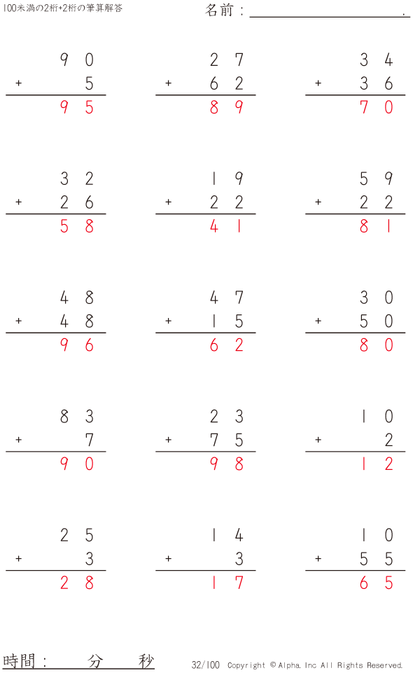 上記のボタンから「100未満の2桁+2桁の筆算」の算数数学ドリル・計算ドリル(PDFプリント)がダウンロードできます。個人利用は無料です(家庭以外での配布は有料です)。