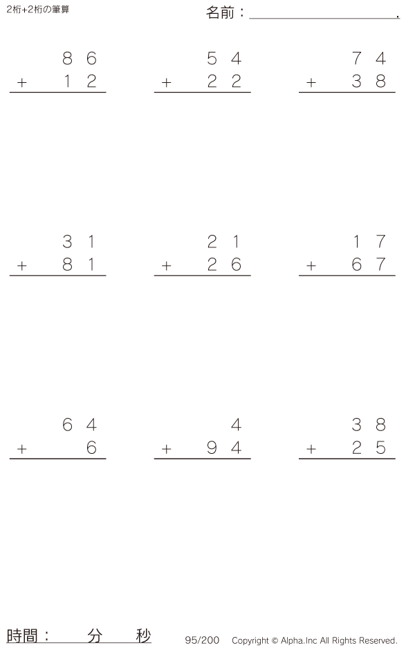 上記のボタンから「2桁+2桁の筆算」の算数数学ドリル・計算ドリル(PDFプリント)がダウンロードできます。個人利用は無料です(家庭以外での配布は有料です)。