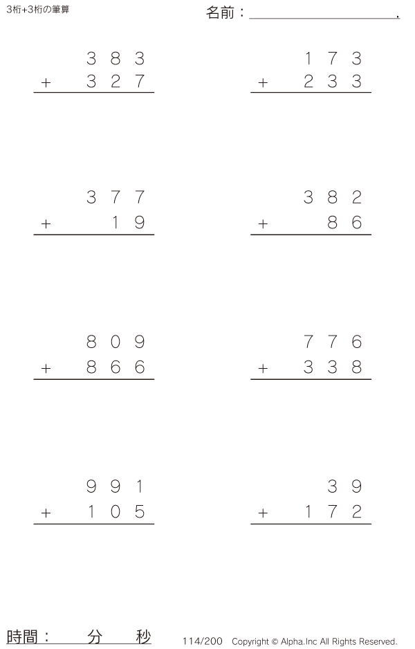 上記のボタンから「3桁+3桁の筆算」の算数数学ドリル・計算ドリル(PDFプリント)がダウンロードできます。個人利用は無料です(家庭以外での配布は有料です)。