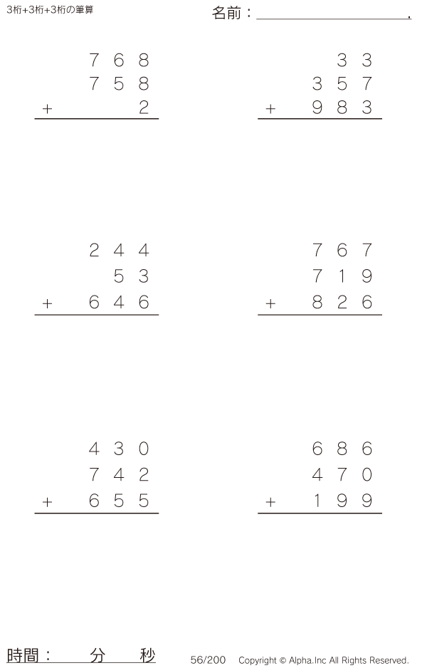 上記のボタンから「3桁+3桁+3桁の筆算」の算数数学ドリル・計算ドリル(PDFプリント)がダウンロードできます。個人利用は無料です(家庭以外での配布は有料です)。