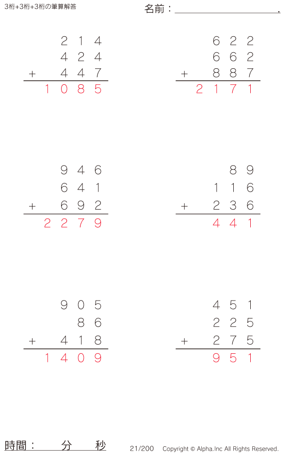 上記のボタンから「3桁+3桁+3桁の筆算」の算数数学ドリル・計算ドリル(PDFプリント)がダウンロードできます。個人利用は無料です(家庭以外での配布は有料です)。