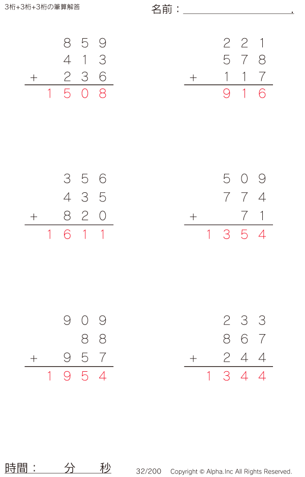 上記のボタンから「3桁+3桁+3桁の筆算」の算数数学ドリル・計算ドリル(PDFプリント)がダウンロードできます。個人利用は無料です(家庭以外での配布は有料です)。