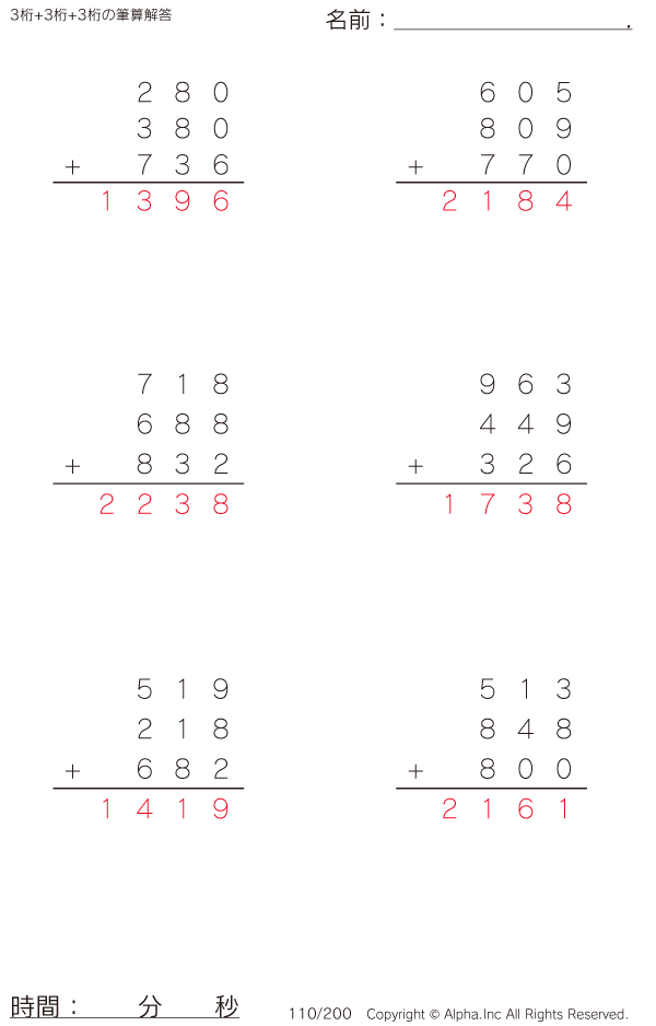 3桁+3桁+3桁の筆算 [解答]110/180