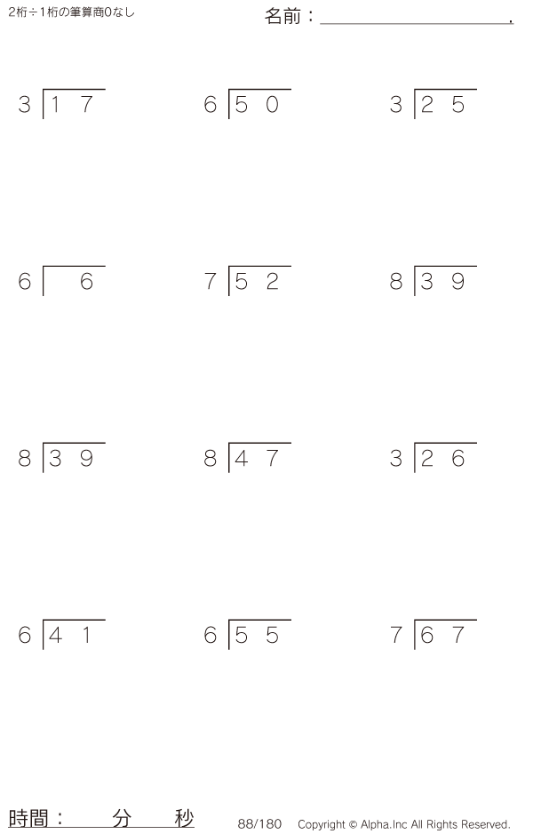 2桁÷1桁の筆算(商0なし) [問題]088/180
