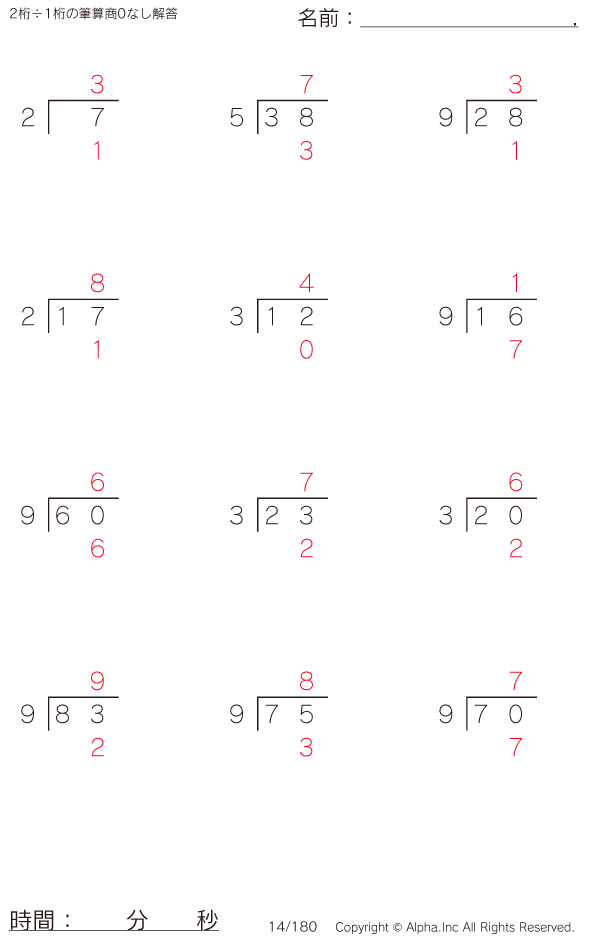 2桁÷1桁の筆算(商0なし) [解答]014/180