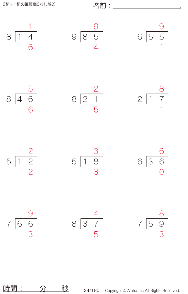 2桁÷1桁の筆算(商0なし) [解答]024/180