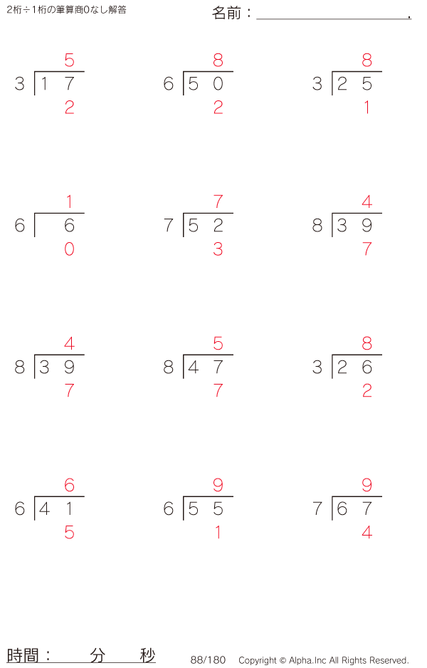 2桁÷1桁の筆算(商0なし) [解答]088/180