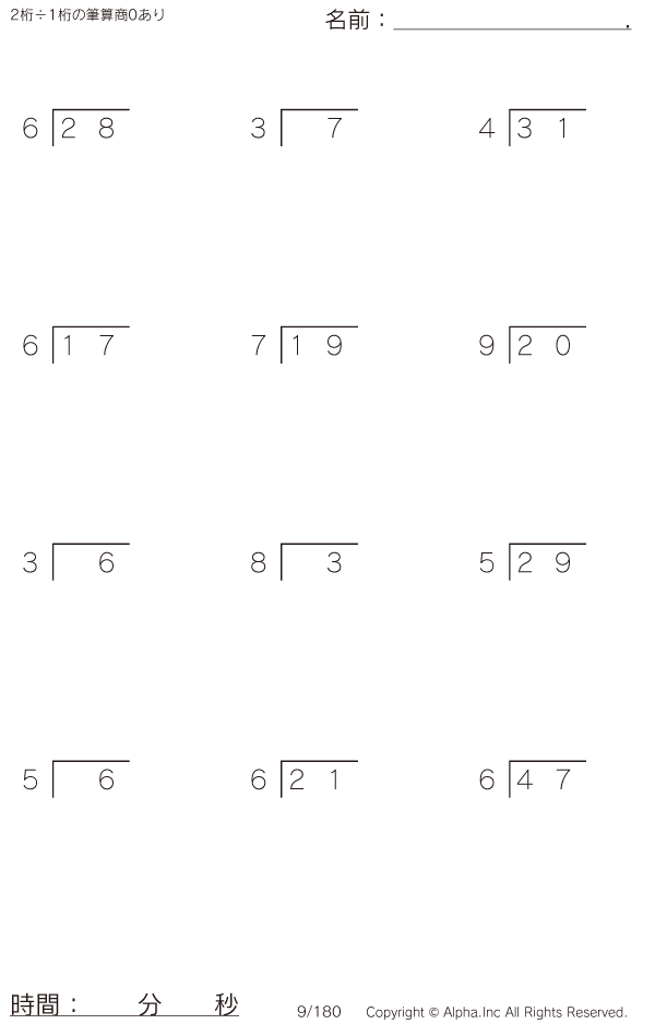 2桁÷1桁の筆算(商0あり) [問題]009/180