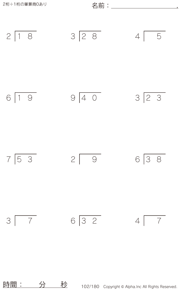 2桁÷1桁の筆算(商0あり) [問題]102/180