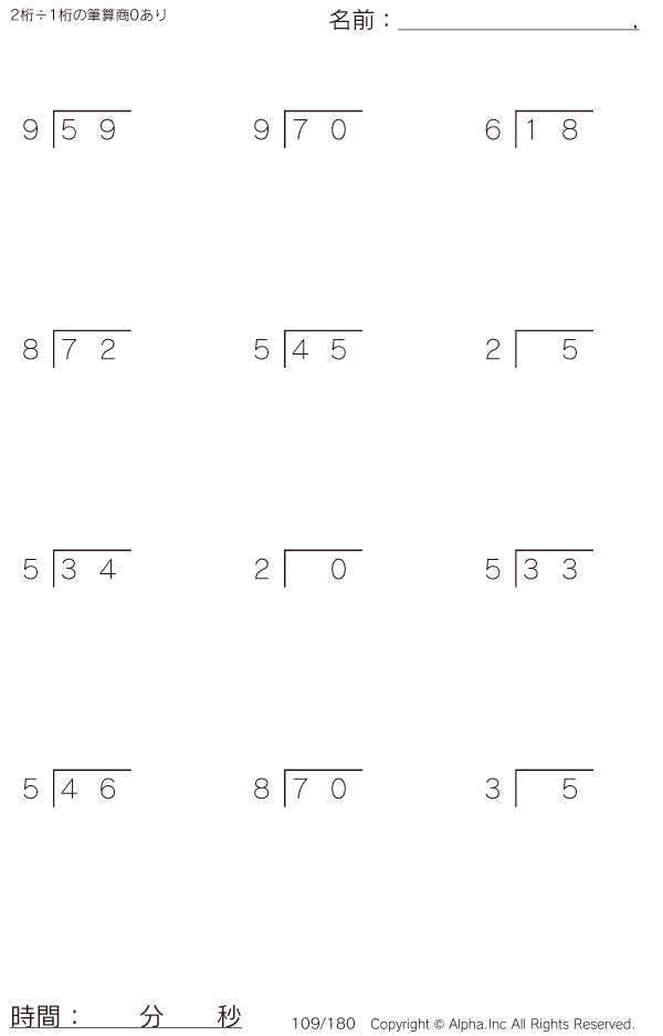2桁÷1桁の筆算(商0あり) [問題]109/180