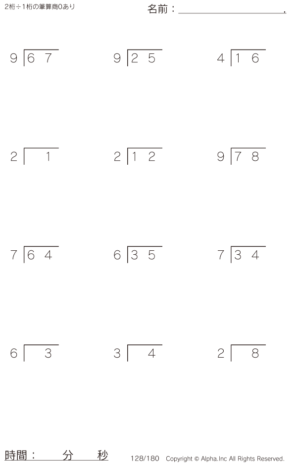 2桁÷1桁の筆算(商0あり) [問題]128/180