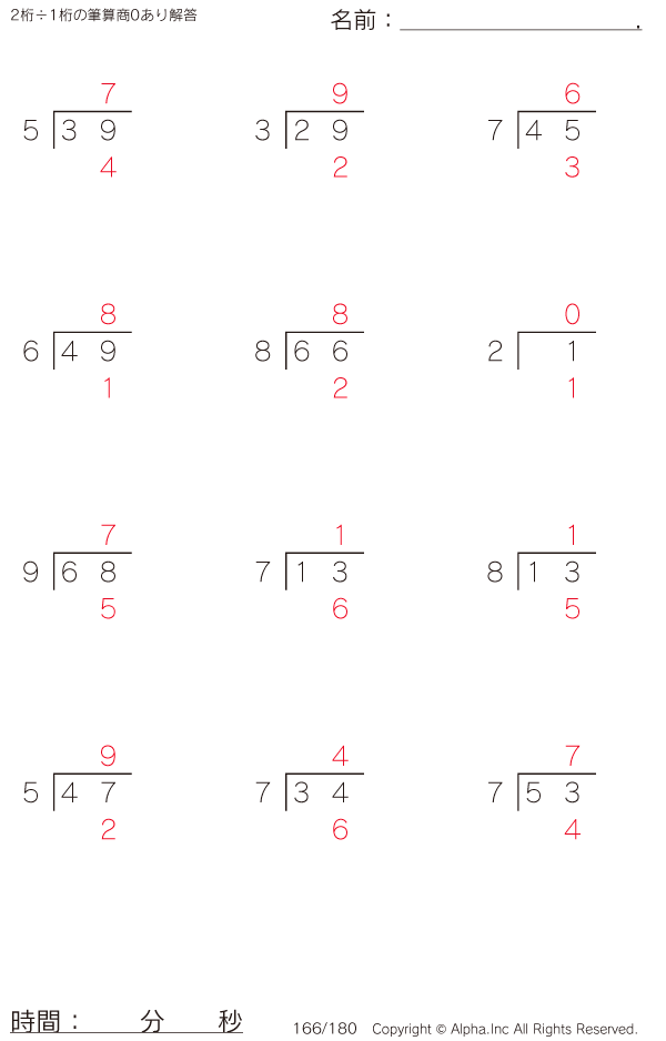 2桁÷1桁の筆算(商0あり) [解答]166/180