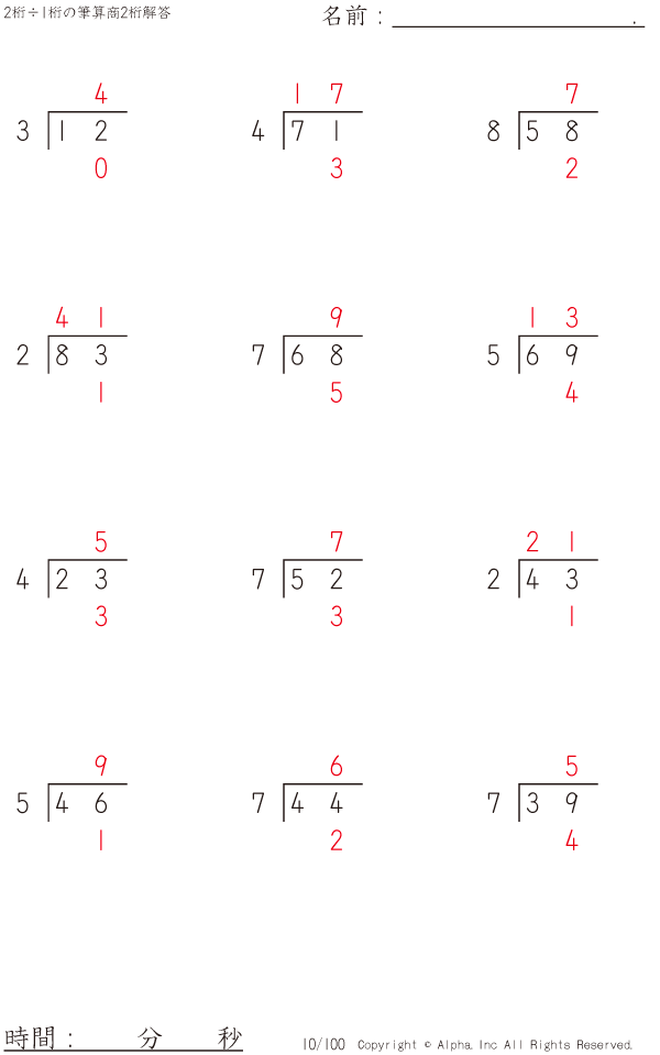 2桁÷1桁の筆算(商2桁) [解答]010/100