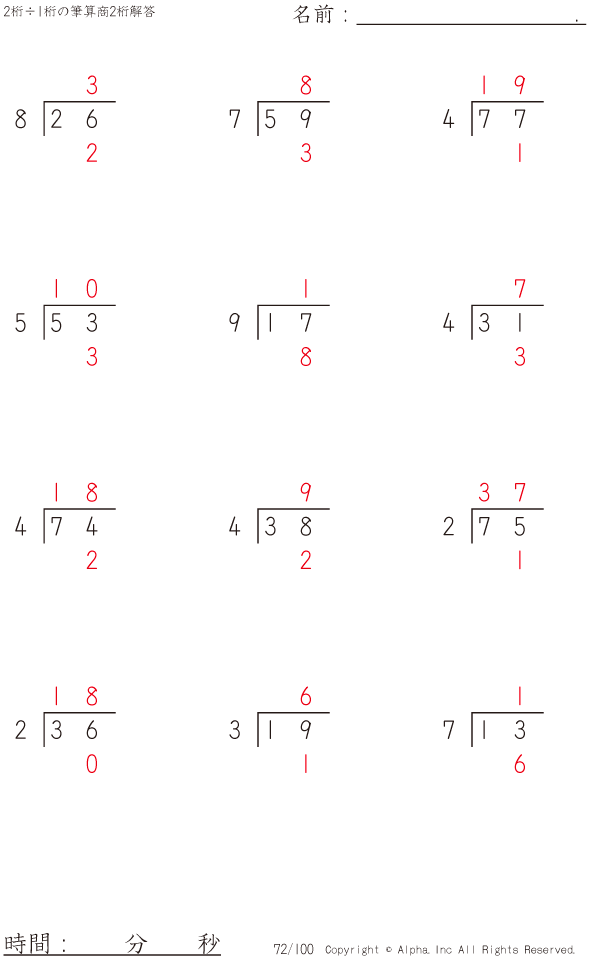 2桁÷1桁の筆算(商2桁) [解答]072/100