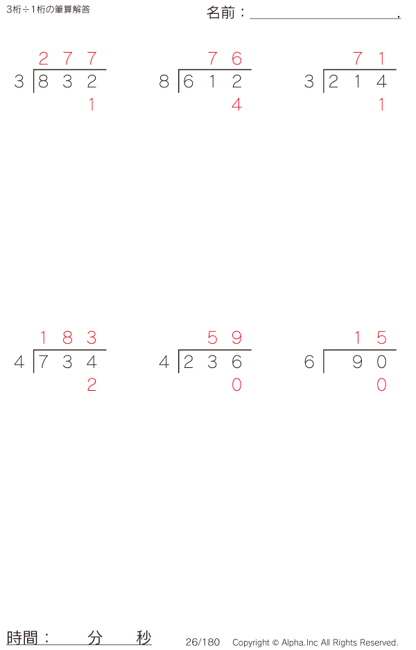 上記のボタンから「3桁÷1桁の筆算」の算数数学ドリル・計算ドリル(PDFプリント)がダウンロードできます。個人利用は無料です(家庭以外での配布は有料です)。