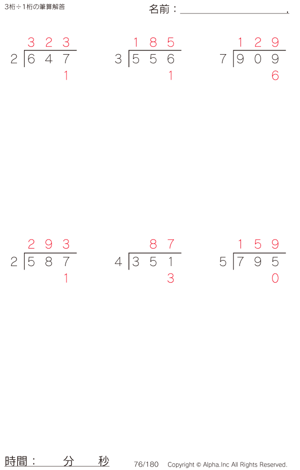 上記のボタンから「3桁÷1桁の筆算」の算数数学ドリル・計算ドリル(PDFプリント)がダウンロードできます。個人利用は無料です(家庭以外での配布は有料です)。