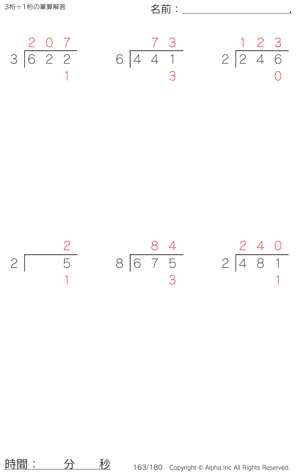 上記のボタンから「3桁÷1桁の筆算」の算数数学ドリル・計算ドリル(PDFプリント)がダウンロードできます。個人利用は無料です(家庭以外での配布は有料です)。