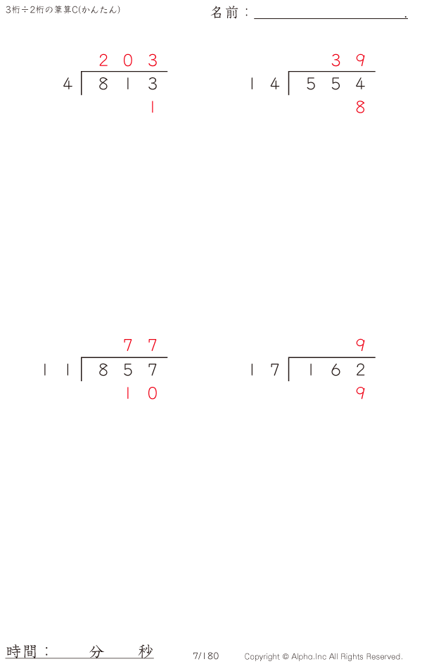 3桁÷2桁の筆算0(20までの数値で割る) [解答]007/180