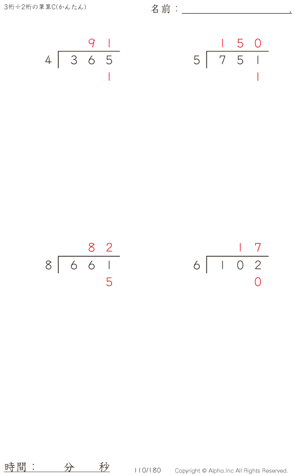 3桁÷2桁の筆算0(20までの数値で割る) [解答]110/180