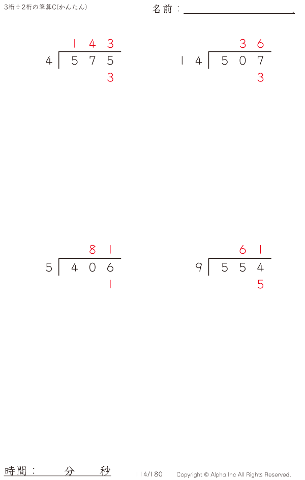 3桁÷2桁の筆算0(20までの数値で割る) [解答]114/180