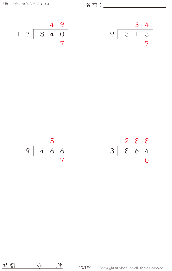 3桁÷2桁の筆算0(20までの数値で割る) [解答]149/180
